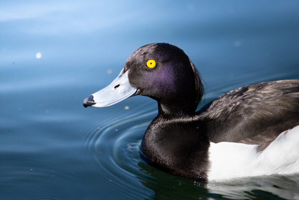 With eyes like molten amber, the tufted duck glides silently across the surface. His plumage – a sharp contrast of inky black and bright white…
